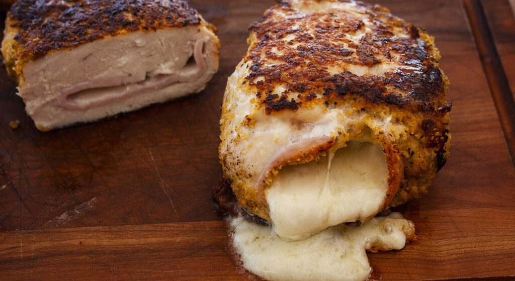 • Prepare your grill and fire it up. Oil the back side of the grates/the griddle to help make the surface non-stick. We recommend either Canola Oil or Duck Fat Spray. You’ll want your grates to be 400°F to 450°F at the surface. If you cook the Cordon Bleu too hot, the cheese will melt too quickly and ooze out. Additionally, flipping too often may cause the piece to fall apart.