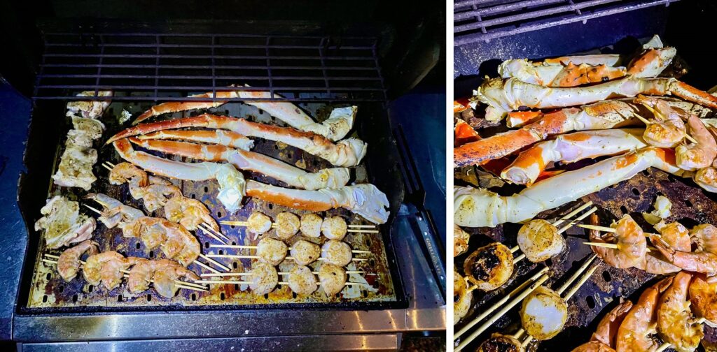 Day 3 was Christmas Eve and we pulled out all the stops. A seafood feast! King Crab Legs, jumbo shrimp and large scallops. (Thank you Costco!) We marinated the shrimp in the shell and used two skewers on both the scallops and the shrimp. Again, I filled the grill twice, and again no leftovers except for a handful of shrimp which I ate the next day with the left-over white sauce.