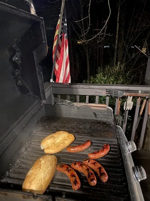 - If you are grilling dinner, it is time to put the food on the grill. Brats, hamburgers, wings, etc. will all be done with minutes to spare.