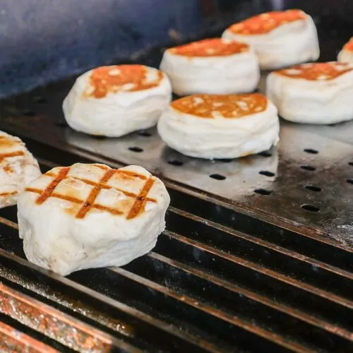 - Biscuits can be made on the flat side or rail side up. Heat your grill up to 350 degrees F and keep flipping until golden.