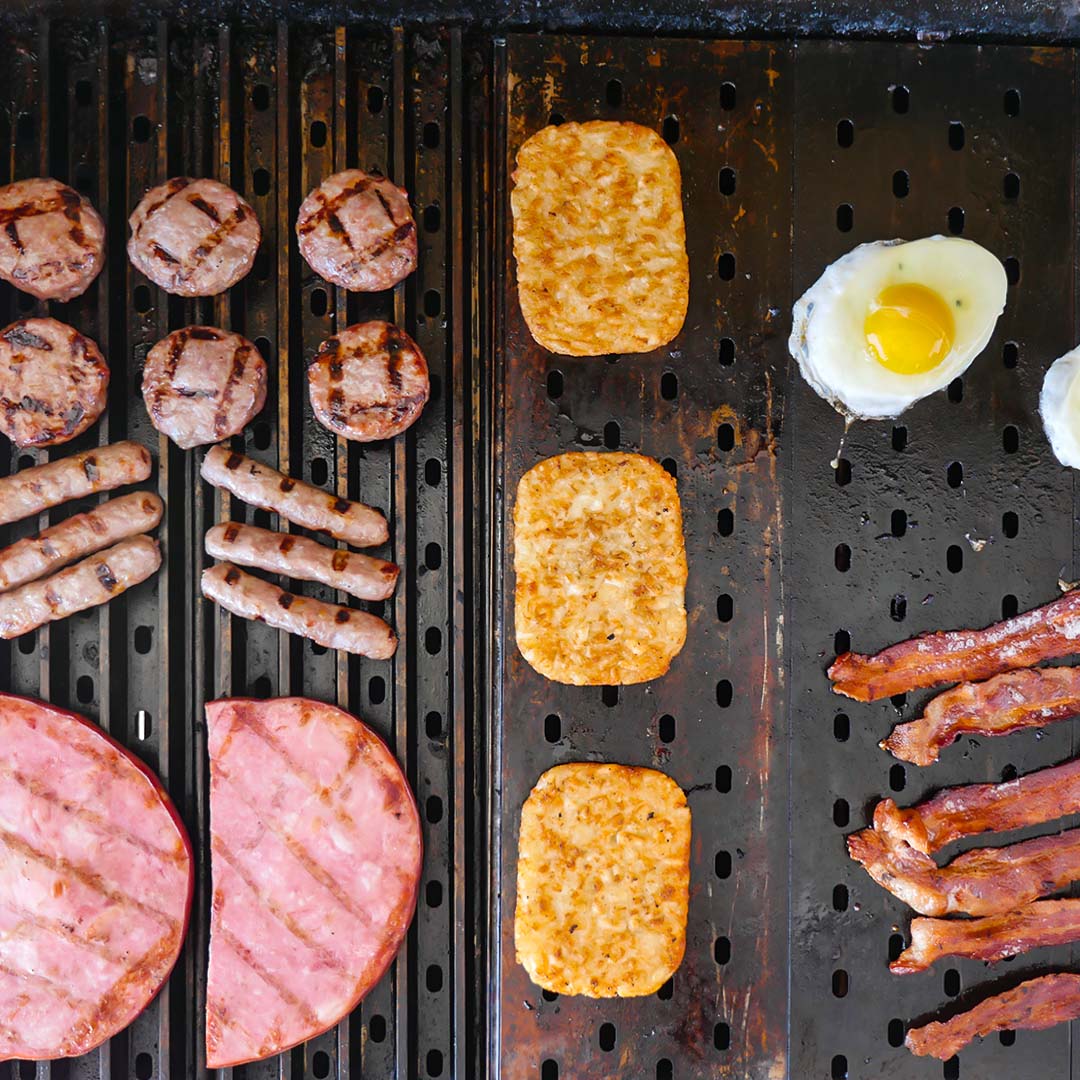 Nothing shows off the versatility of GrillGrates more than grilling breakfast. Flip some or all GrillGrates over and channel your inner short-order cook! When friends and family are home for the holidays start the day with a grraaaate grilled breakfast. Breakfast meats are simple, fast, and easy on the flat side. Move the meats off the heat and bring on the eggs, pancakes, French toast, and more!