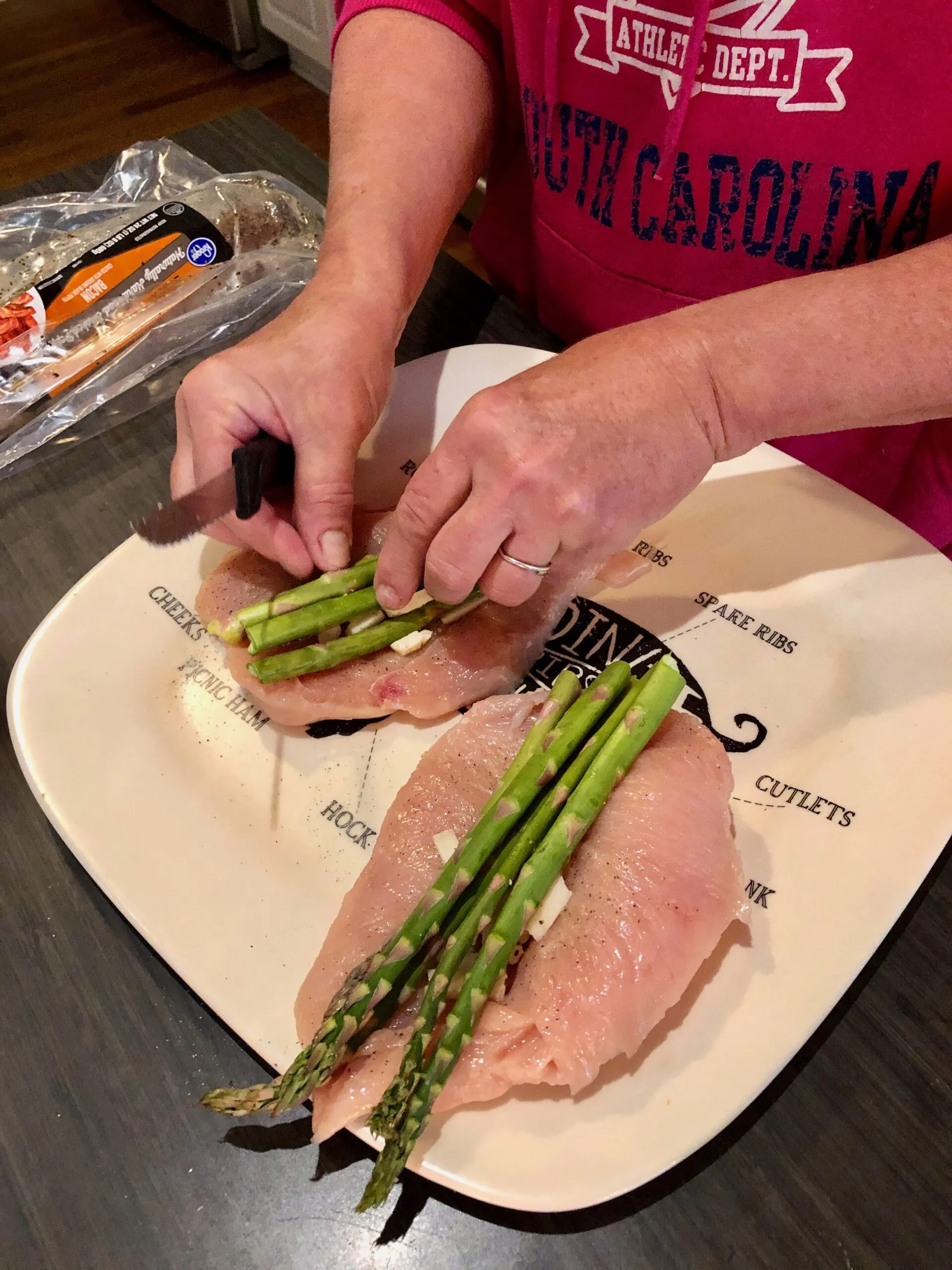 Susan loves the PINZ for bacon wrapped everything. The second version was stuffed with 3-4 spears of asparagus and some hard cheese. Stuffed, bacon wrapped chicken breast is a great recipe to take and make your own. Chicken is a really great lean, versatile protein that you can do a lot with, especially on the grill.