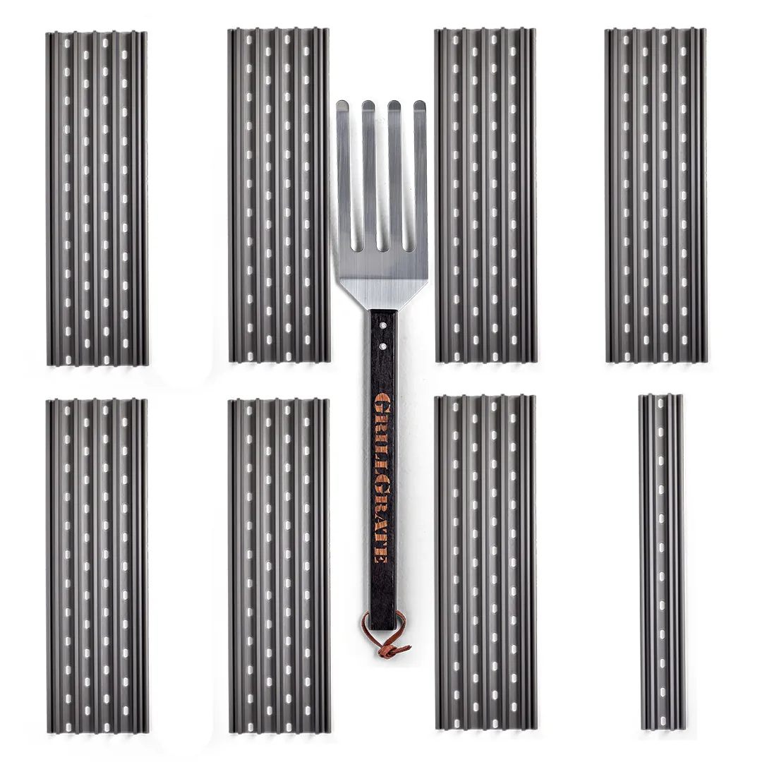 These reversible interlocking panels replace the existing grates on your gas grill, and immediately kick your cooking up a notch. Flare-ups are no longer a concern as heat concentrates up the raised rails, making burnt, charred and dry food a thing of the past. Your new secret weapon will bring you from everyday grill enthusiast to newly crowned neighborhood GrillMaster known for creating professional level sear marks every time.