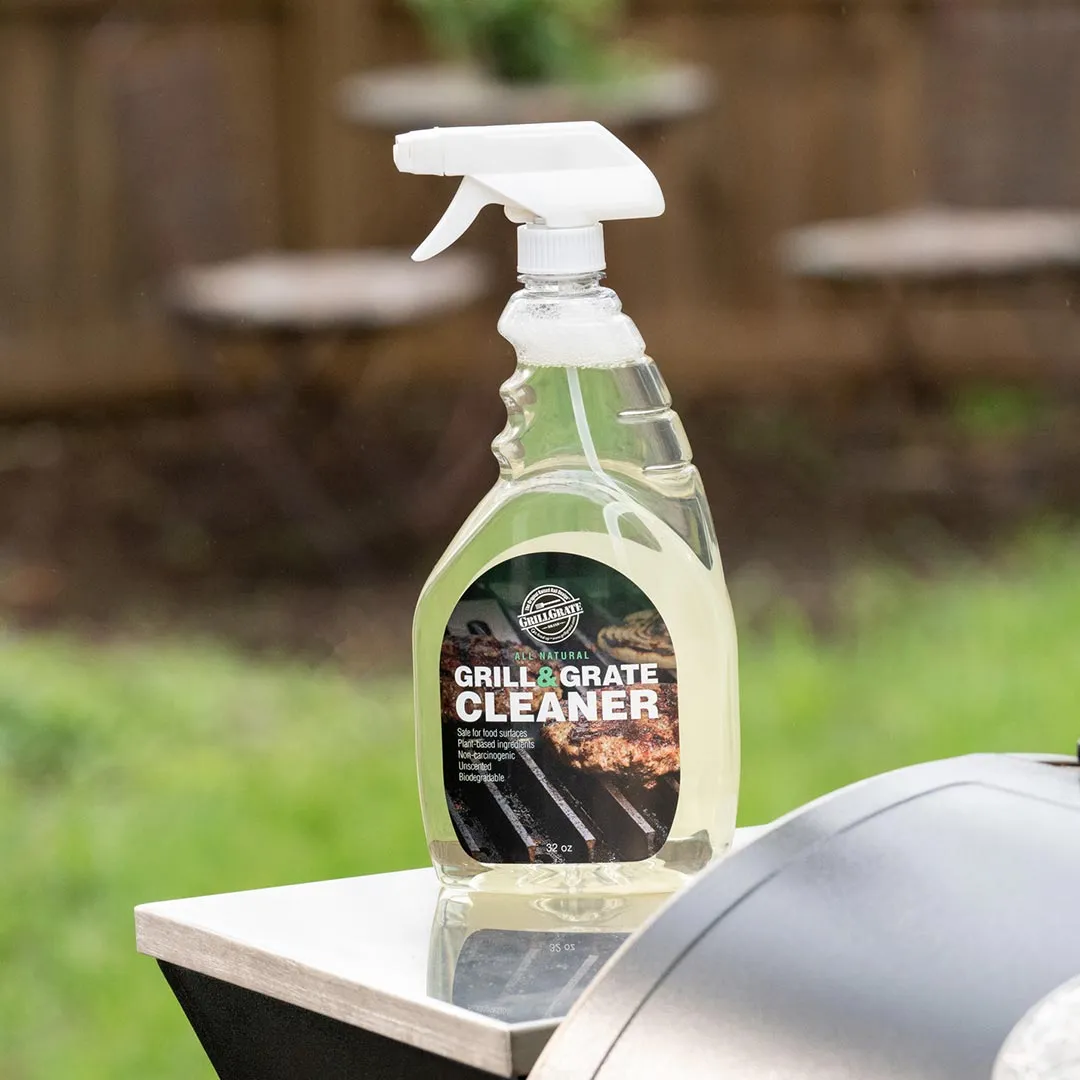 GrillGrate’s Grill & Grate Cleaner is specially formulated for use on GrillGrates and your entire grill. Safely loosens and dissolves built on grease. Simply spray on your GrillGrates and allow to dwell for 10 minutes. Scrub surface with grill brush (we recommend the Grate Valley Brush) or pad. Re-apply if necessary. Rinse or wipe off with damp cloth. 32oz bottle