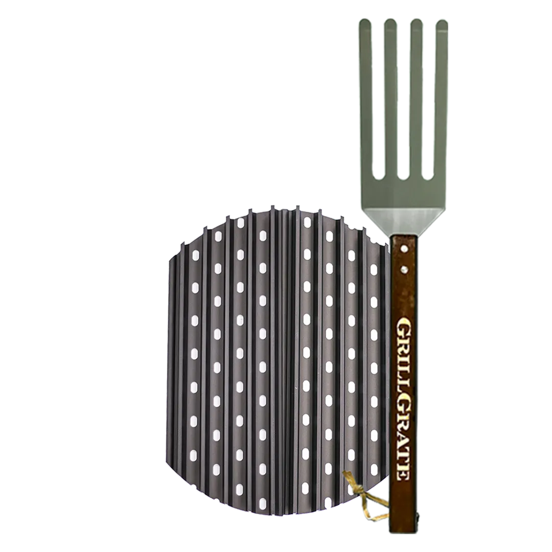 GrillGrates deliver more control and flexibility when grilling on your fire pit. They act as a flame shield, allowing more direct grilling at higher temperatures. GrillGrates are used as a sit-on-top solution. The Hard Anodized Aluminum and Raised Rail design promote conductivity and control for juicier, more flavorful food. Every set comes with a ComboTong which is part GrateTong, part GrateTool that fits between the rails to get under your food and lift it without scraping. IMPORTANT NOTE: We recommend five pieces of wood to get the flame going and placing the GrillGrate set on top of the existing fire pit grate. If the height of your fire pit’s grate is adjustable place the grates three to six inches above the flame when cooking, adding more wood when the flame gets low. GrillGrates feature: