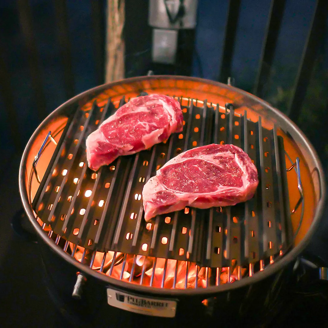GrillGrates deliver more control and flexibility to charcoal grills. They act as a flame shield allowing more direct grilling at higher temperatures. GrillGrates for charcoal grills are used on top of the existing surface. Made of hard anodized aluminum, they never rust. GrillGrates are reversible, interlocking panels, giving you two grill surfaces in one. Even out those hot and cold spots with GrillGrates and produce juicier, more flavorful food. Here’s how: