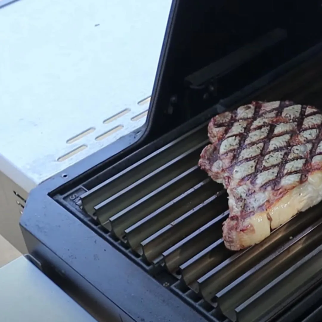 Never burn a steak again. The flame shield eliminates flare-ups. And the raised rails deliver the perfect sear.