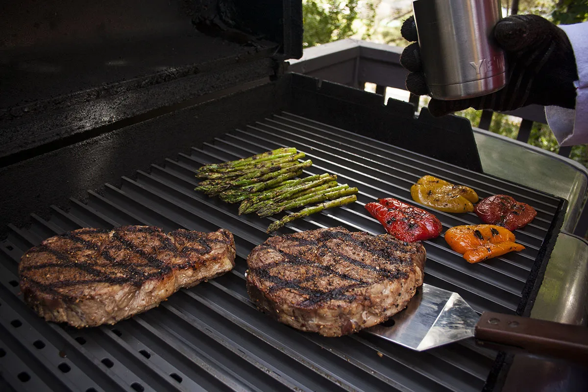 Never burn a steak again. The flame shield eliminates flare-ups. And the raised rails deliver the perfect sear.
