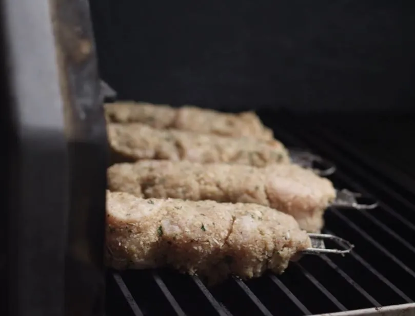 Roll the chicken into a tight spiral. Slice into 2” segments. Thread the spiraled segments onto skewers.