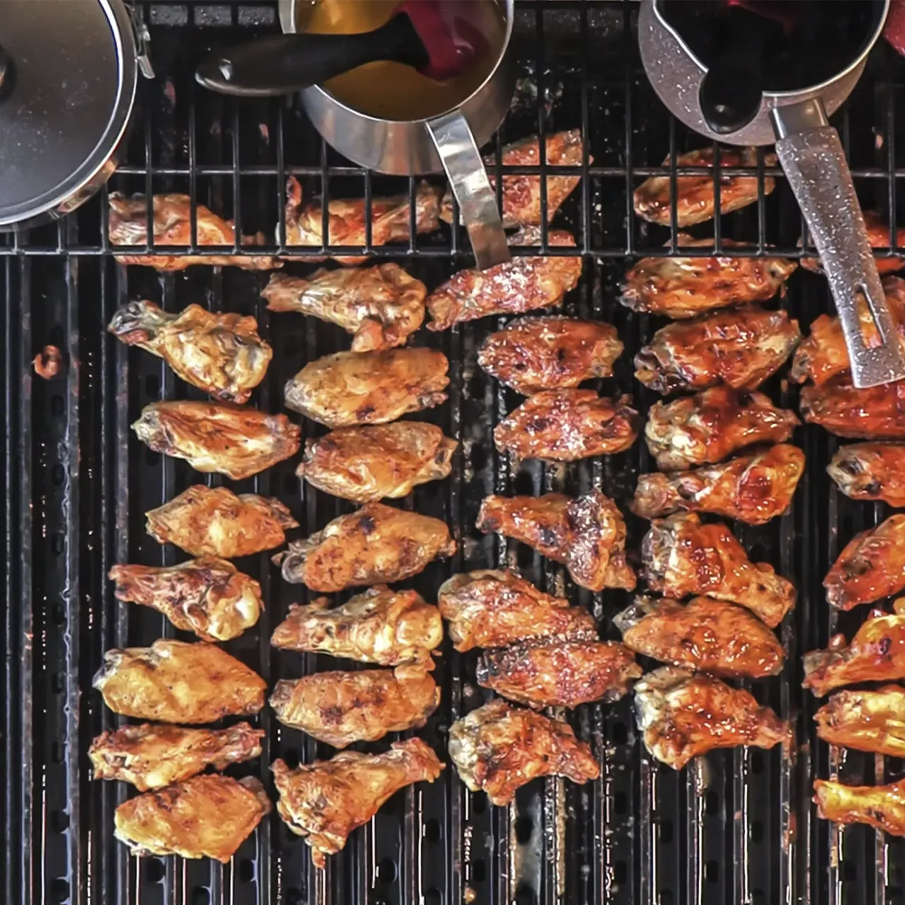 Once temp reads 185 F, baste wings with sauces and continue to cook turning and basting once.