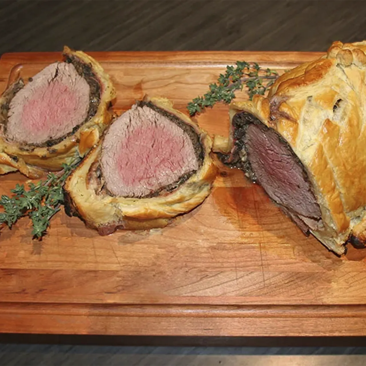 Place two pieces of the puff pastry slightly overlapping on a lightly floured surface. Using a rolling pin roll out the puff pastry to about half of its original thickness. Remove the plastic wrapped tenderloin from the refrigerator and carefully unwrap it and place on the lower half of the puff pastry. Roll the puff pastry over the entire tenderloin so that it is completely enveloped. Trim excess pastry from the ends and tuck the pastry underneath. Prepare an egg wash with the two eggs and a bit of water. Brush the uncooked Wellington with the egg wash. If you are feeling creative, you can decorate your Wellington with additional puff pastry. We did a few spiral stripes and some holly leaves and berries. Spray a baking sheet with some cooking spray and place the Wellington onto the sheet. Place in preheated pellet grill, oven or grill. Allow to cook for about 30 minutes before checking the internal temperature with an instant read thermometer. You are shooting for a nice golden-brown crust with internal temperature of the meat around 130F. Keep in mind you will have some carry over cooking.