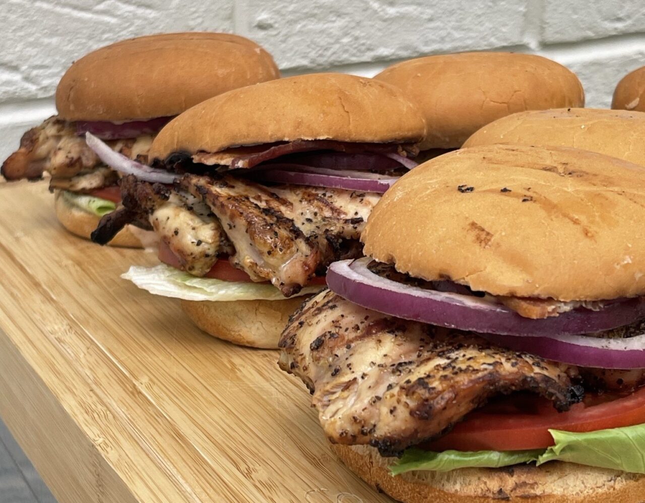 Toast the burger buns on the grill or in a toaster until they are lightly browned. Spread a generous amount of Sriracha Ranch sauce on the bottom half of each bun. Place a lettuce leaf on top of the sauce, followed by a slice of tomato. Add two grilled chicken thighs on top of the tomato along with 2 pieces of cooked bacon. • Add red onion slices if desired. Top with the other half of the bun.