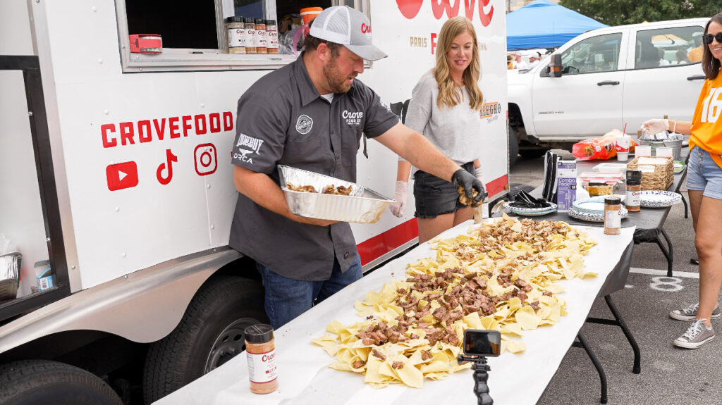 A huge thanks to our sponsors GrillGrate, Tennessee River Jam, ORCA, Cowboy Charcoal and Allegro Marinade, we were able hand out FREE samples to friends, family and strangers who stopped by before the game. We loved getting to show off the products from our sponsors at this stop such as: GrillGrates for our Weber Kettle, ORCA Cooler Hard side to keep all our food cold, Cowboy Charcoal’s Charcoal and Applewood Pellets, Cowboy Charcoal Briquettes and Allegro Marinade Nashville Hot. We also got to showcase and cook with our new line of Crove Food Co. Rubs & Seasonings which include Beef, Fajita, Poultry and Pork and are available to order online. Shop now at crovefood.com.