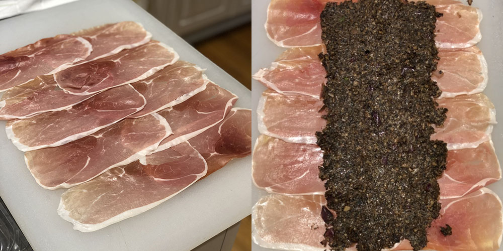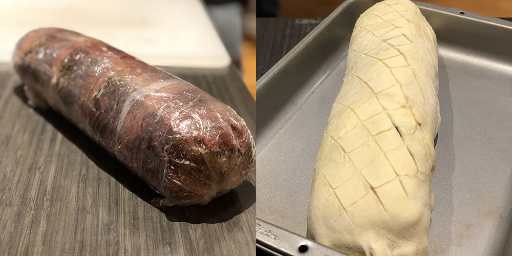 Arrange the prosciutto on a flat surface overlapping slightly so that you have an area roughly 12” x 18”. Spread the mushroom mixture on top of the prosciutto, down the center. Remove the tenderloin from the refrigerator and cut off the butcher twine and brush the entire thing down with Dijon mustard. Place the Dijon coated tenderloin on top of the mushroom mixture. Wrap the prosciutto completely around the tenderloin so that it is completely covered. Lay out two large sheets of plastic wrap on a flat surface slightly overlapping. Place the prosciutto wrapped tenderloin on the plastic wrap and wrap the entire thing up much like you did with the prosciutto. Firmly grab the ends on the plastic wrap and roll the tenderloin up into a tight sausage of sorts. Tie the ends of the plastic wrap tightly so the tenderloin holds its nice round shape. Place into a refrigerator for at least an hour or overnight. The final steps of wrapping with the puff pastry can be done about an hour or so before you plan to eat.