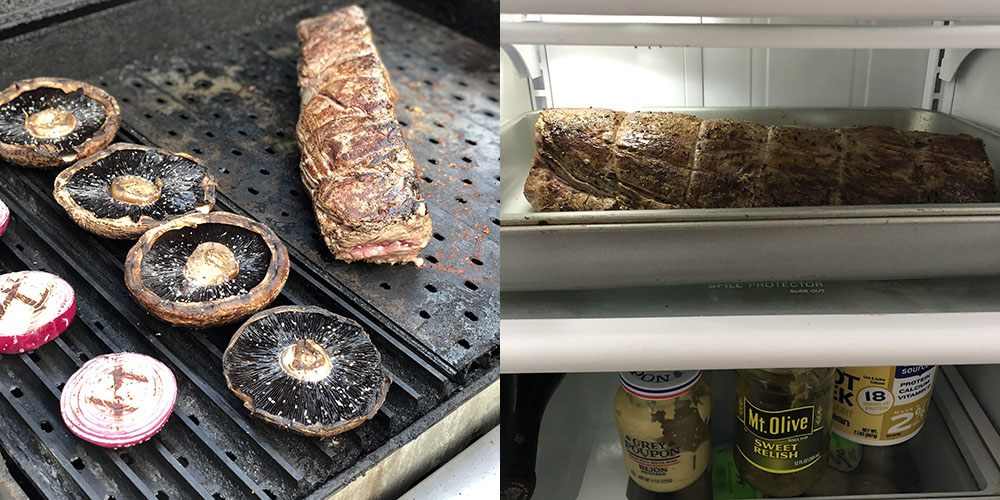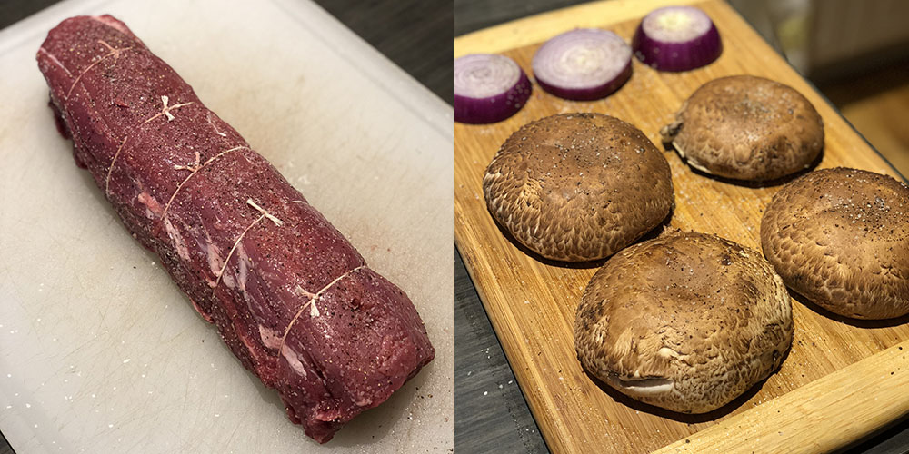 Set your grill up so that you have a section of grates with the flat side up and a section with the rails up. Preheat the grill to medium high so that the surface of the grates is at least 650F. Ensure the flat surface is clean prior to cooking. Place the onions and mushrooms on the rails and the tenderloin on the flat side. Sear the beef tenderloin on all sides to a nice golden brown. Grill the mushrooms and onions until they are tender. Remove everything from the heat and cool down by placing in a refrigerator.