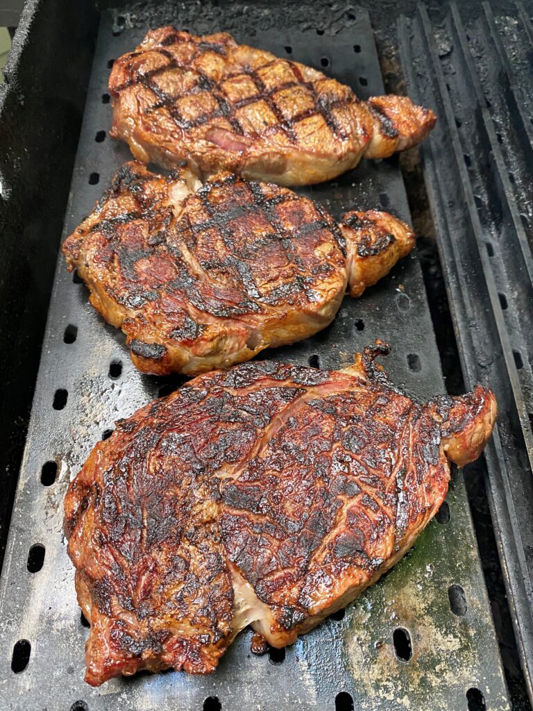 3 Steaks, 3 Tastes. Top: traditional sear marks. Middle: “The Ruth’s Chris Kiss” – grill on the rails, finish on the flat side (about 30 seconds). Bottom: full sear from harder flat side searing (about 60 seconds).